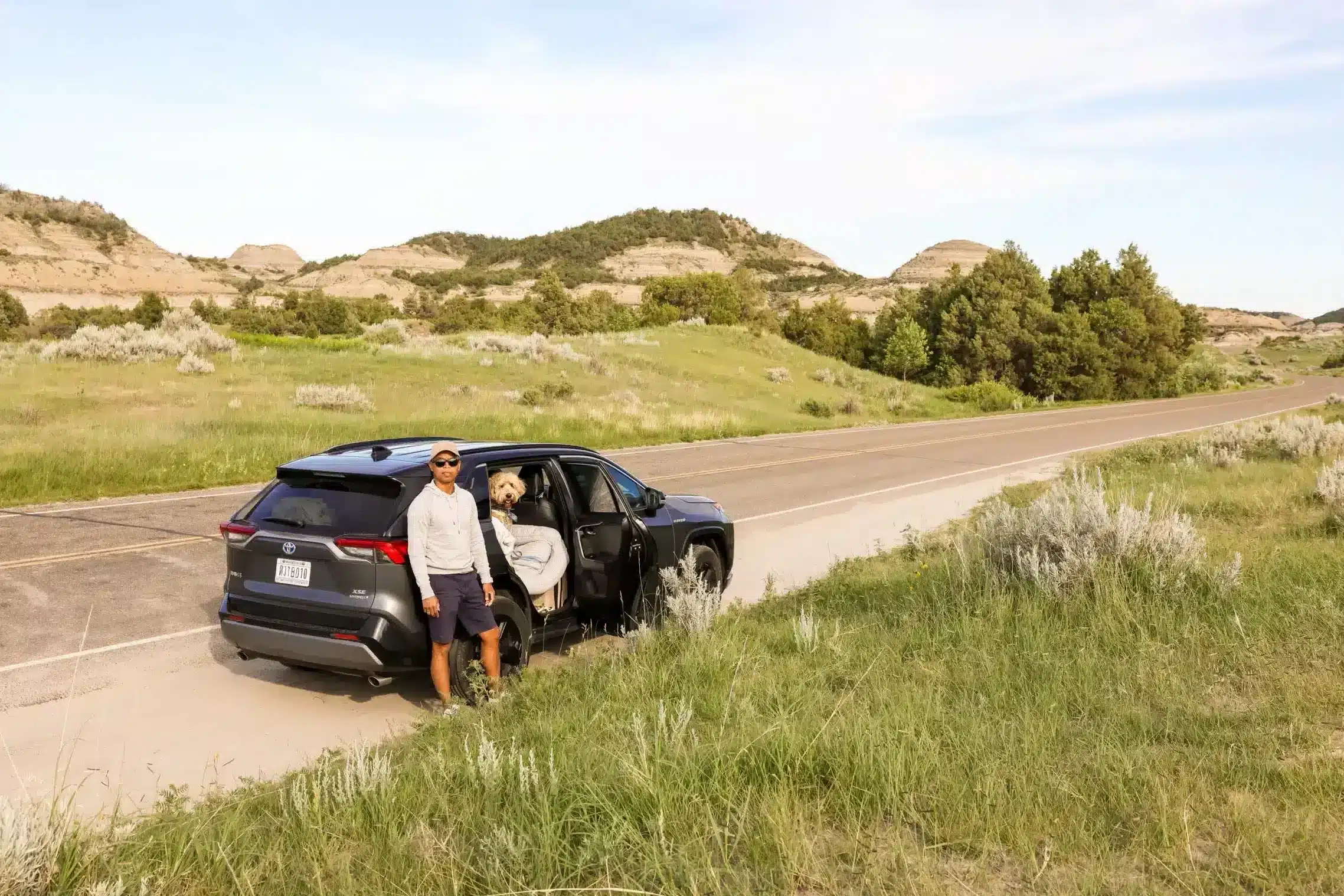 Plan regular breaks every 2–3 hours for stretching, water, and quick potty walks. We like to map out scenic rest stops or grassy exits in advance — it turns the drive into part of the adventure.