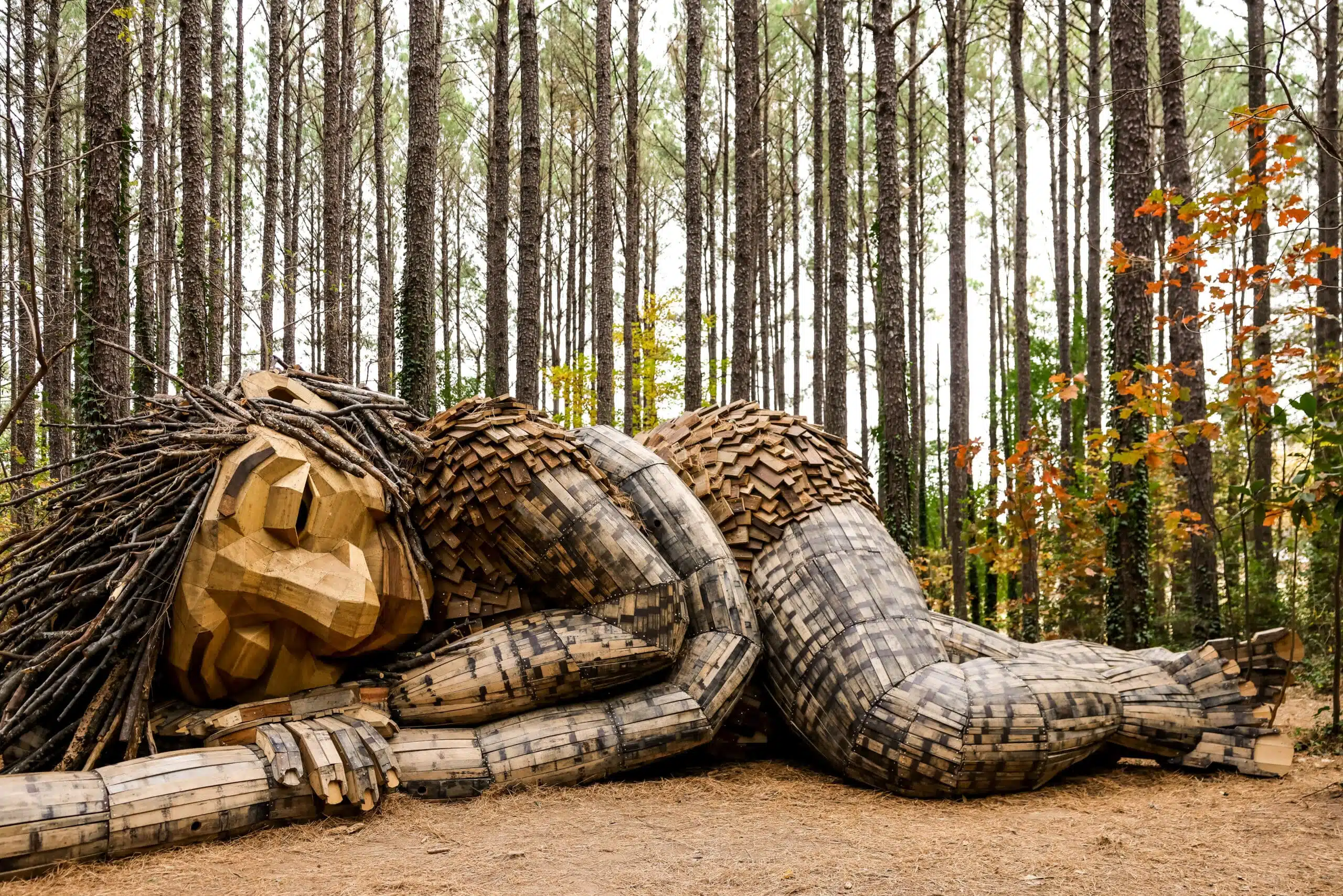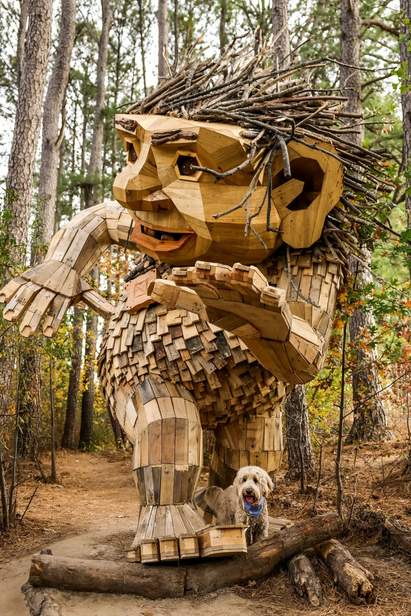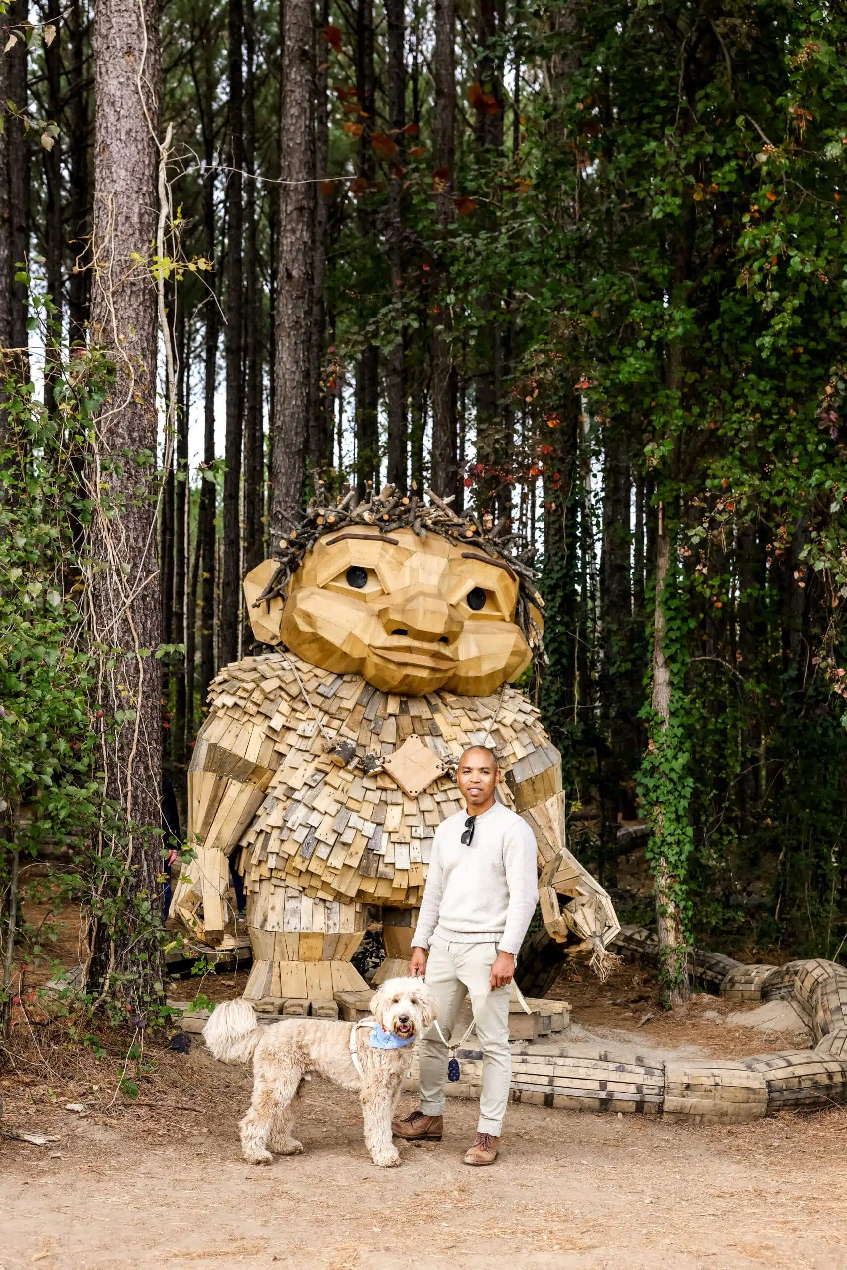 The park is home to five members of Thomas Dambo’s family of seven giant trolls, larger-than-life sculptures built from reclaimed materials that tell a story about sustainability, environmental stewardship, and connection to place. The trolls are spread across Dix Park and nearby cities, turning the search itself into part of the artwork.